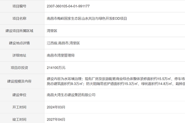 南昌市湾里管理局找准自身定位,厚植生态优势,坚定不移走生态优先、绿色发展之路,全力谱写“生态梅岭、幸福湾里”大美画卷。 近日,梅岭国家生态区山水共治与绿色开发EOD项目完成审批备案! 01 项目最新规划 根据备案显示,梅岭国家生态区山水共治与绿色开发EOD项目总投资214100万元 。 建设内容为水环境...