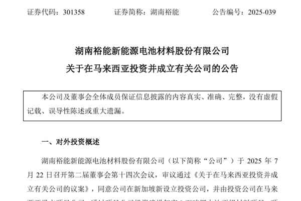 湖南裕能新能源电池材料股份有限公司(简称:湖南裕能)近日公告称,公司拟在新加坡新设立投资公司,并由投资公司在马来西亚设立项目公司,通过项目公司投资建设年产9万吨锂电池正极材料项目。项目总投资约5.6亿马来西亚林吉特,约合人民币9.5亿元(最终投资金额以项目建设实际投入为准)。 湖南裕能表示,公司本次项目投资,可以更好服务于东盟等地区...