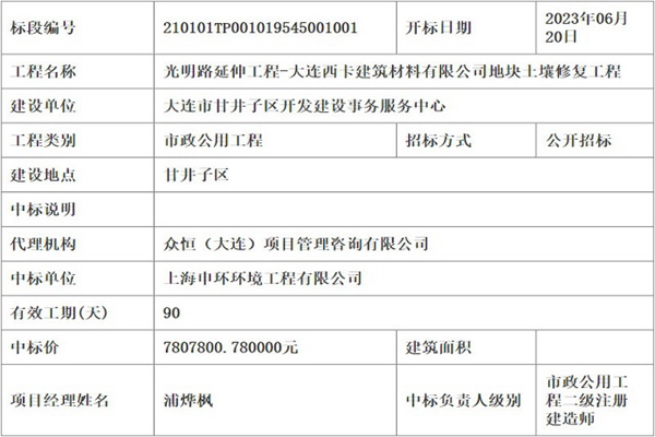2023年6月30日,光明路延伸工程-大连西卡建筑材料有限公司地块土壤修复工程公布中标结果,中标供应商为上海申环环境工程有限公司,中标价780.780078万元。 项目招标人为大连市甘井子区开发建设事务服务中心,工程对大连西卡建筑材料有限公司地块土壤修复项目进行污染治理,总面积约8494.2㎡,污染面积约8085.02㎡,污染方量约...