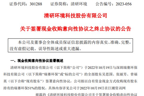 近日,清研环境科技股份有限公司(简称:清研环境)公告称,决定终止收购现有股东持有的瑞赛环保51%的股权。据悉,清研环境与深圳瑞赛环保科技有限公司的全部股东在2022年10月19日签署了意向性协议,拟通过自有资金现金方式进行。 清研环境披露称,自上述意向性协议签署后,公司委托中介机构对标的公司进行尽职调查、审计、评估等工作,期间公司与...