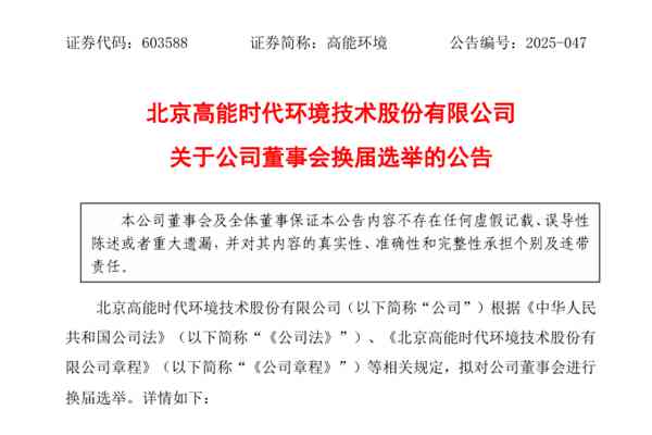 北京高能时代环境技术股份有限公司(简称:高能环境)近日公告称,公司拟进行董事会换届选举,第六届董事会由9人组成,其中独立董事不少于3人。 经公司提名委员会审查,高能环境第五届董事会拟提名李卫国先生、凌锦明先生、张华振先生、龙少鹏先生、孙敏先生为公司第六届董事会非独立董事候选人,拟提名王竞达女士、黄常波先生、刘力女士为独立董事候选人。...