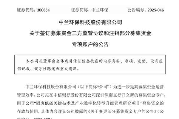 中兰环保科技股份有限公司(简称:中兰环保)近日公告称,公司与中信银行股份有限公司深圳分行(下称“中信银行”)、保荐机构中原证券股份有限公司(下称“中原证券”)签署了《募集资金三方监管协议》,同时将存放在上海浦东发展银行股份有限公司深圳深圳湾支行募集资金专户的募集资金余额(含利息收入及理财...