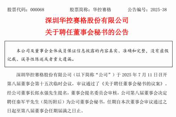 深圳华控赛格股份有限公司(简称:华控赛格)近日公告称,经公司董事长郎永强先生提名,董事会提名委员会审核,公司第八届董事会决定聘任秦军平先生为公司董事会秘书,任期自本次董事会审议通过之日起至第八届董事会任期届满之日止。图源:华控赛格公告 据悉,华控赛格的主营业务涵盖海绵城市建设、水务工程、智慧水务建设运营、EPC总承包、工程咨询设计及...