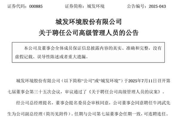 城发环境股份有限公司(简称:城发环境)近日公告称,经公司总经理提名,董事会提名委员会审核同意,公司董事会同意聘任牛鸿武先生为公司副总经理。任期与公司第七届董事会任期一致,可连聘连任。图源:城发环境公告 申明:本站发布此信息的目的在于传播更多信息,与本站立场无关。并且郑重提示所有阅读者,股市有风险,投资需谨慎,本文不作为任何投资的参考...