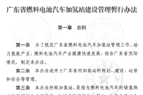 为了规范广东省燃料电池汽车加氢站管理工作,助力氢能产业、燃料电池汽车产业健康快速发展,结合广东省实际情况,广东省制定了《广东省燃料电池汽车加氢站建设管理暂行办法》,适用于广东省内加氢站的规划、建设、运营和安全等管理。 本办法所称加氢站, 是指为燃料电池汽车的储氢瓶充装氢燃料的专门场所,包括单独建设的加氢站、加氢合建站和制氢加氢一体...