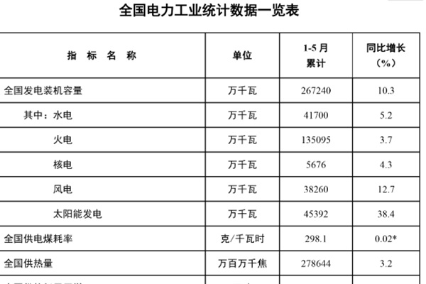 6月20日,国家能源局发布2023年1-5月份全国电力工业统计数据。 截至5月底,全国累计发电装机容量约26.7亿千瓦,同比增长10.3%。其中,太阳能发电装机容量约4.5亿千瓦,同比增长38.4%;风电装机容量约3.8亿千瓦,同比增长12.7%。 1-5月份,全国发电设备累计平均利用1430小时,比上年同期减少32小时。其中,水...