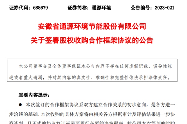近日, 安徽省通源环境节能股份有限公司发布《关于签署股权收购合作框架协议的公告》,被收购方为安徽弘徽科技有限公司,本次收购,通源环境拟以现金方式收购标的公司不少于51%的股权,预计交易金额为人民币1.53~3亿元。 本次双方签署的股权收购合作框架协议系双方建立合作关系的初步意向,是各方进一步洽谈的基础,本次收购的具体方案将由相关各方...