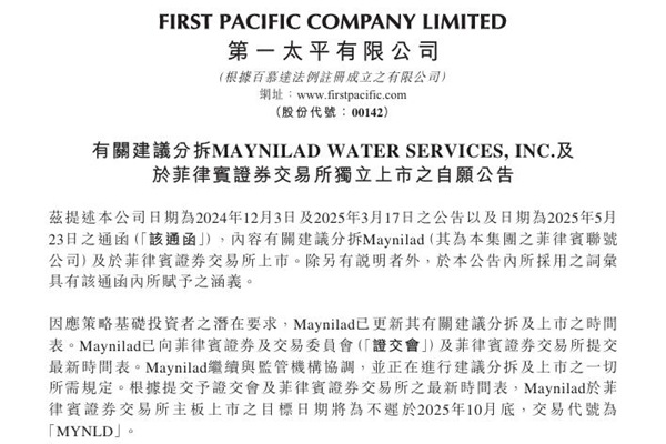 2025年06月23日,第一太平有限公司发布《有关建议分拆MAYNILAD WATER SERVICES, INC.及于菲律宾证券交易所独立上市之自愿公告》。图源:第一太平公告 计划分拆其菲律宾联号公司Maynilad Water Services, Inc.并在菲律宾证券交易所独立上市。Maynilad的上市目标日期定为不迟于20...
