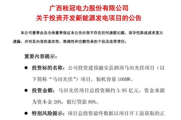 2025年06月24日,广西桂冠电力股份有限公司发布《关于投资开发新能源发电项目的公告》。图源:桂冠电力公告 桂冠电力计划投资建设马田光伏项目,总投资额约3.95亿元,资金来源为资本金20%,银行贷款80%。马田光伏项目由公司全资子公司广西大唐桂冠新能源有限公司的全资子公司大唐桂冠(融安)新能源有限公司投资建设,目建设期约8个月。 ...