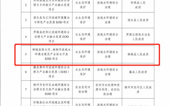 近日,自治区生态环境厅、国家开发银行广西分行、农业发展银行广西分行联合公布2023年第一批自治区生态环境导向的开发(EOD) 模式项目名单,柳州市柳城县保大河、杨柳河流域水环境治理及产业综合开发EOD模式项目成功获批入库,为探索生态产品价值实现路径迈出新步伐。 该项目结合保大河、杨柳河地理位置、生态环境、自然景观以及县区内农副产品、...
