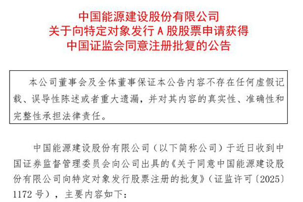 2025年06月12日,中国能源建设股份有限公司发布《关于向特定对象发行 A 股股票申请获得中国证监会同意注册批复的公告》。图源:中国能建公告 中国能源建设股份有限公司(以下简称公司)于近日收到中国证券监督管理委员会向公司出具的《关于同意中国能源建设股份有限公司向特定对象发行股票注册的批复》(证监许可〔2025〕1172 号),主要...