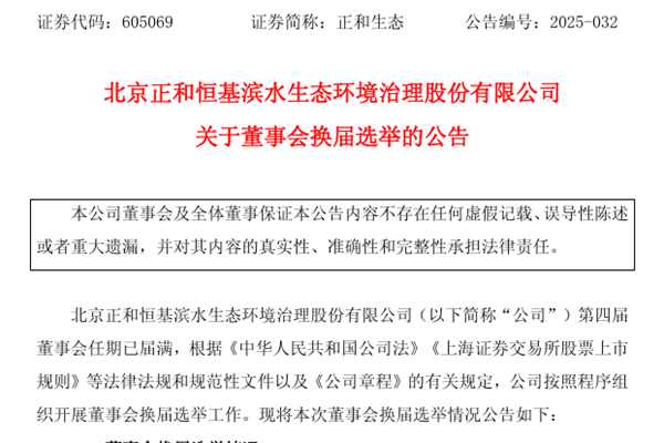 北京正和恒基滨水生态环境治理股份有限公司(简称:正和生态)近日公告称,公司)第四届董事会任期已届满,将按照程序组织开展董事会换届选举工作,情况如下↓ 公司第五届董事会拟由9名董事组成,其中非独立董事6名,独立董事3名。公司于2025年6月12日召开第四届董事会第三十次会议,审议通过了《关于董事会换届选举暨提名第五届董事会非...