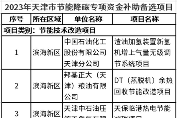 市发展改革委关于公布2023年天津市节能降碳专项资金补助备选项目名单的通知 各区节能主管部门,有关单位: 按照《市发展改革委市财政局关于组织申报2023年天津市节能降碳专项资金补助备选项目的通知》,各区共申报项目74个。其中,节能技术改造项目43个,高效设备推广项目21个,降碳技术示范项目1个,资源循环利用项目5个,清洁生产改造项...