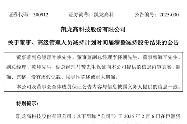 凯龙高科技股份有限公司(简称:凯龙高科)公告称,公司于近日分别收到董事兼副总经理叶峻先生、董事兼副总经理李怀朝先生、董事邹海平先生、副总经理丁乾坤先生、副总经理马赟先生分别出具的《关于股份减持计划实施完毕的告知函》或《关于股份减持计划时间届满的告知函》,截至2025年5月27日,本次减持计划时间已届满。 据凯龙高科2025年2月6日...