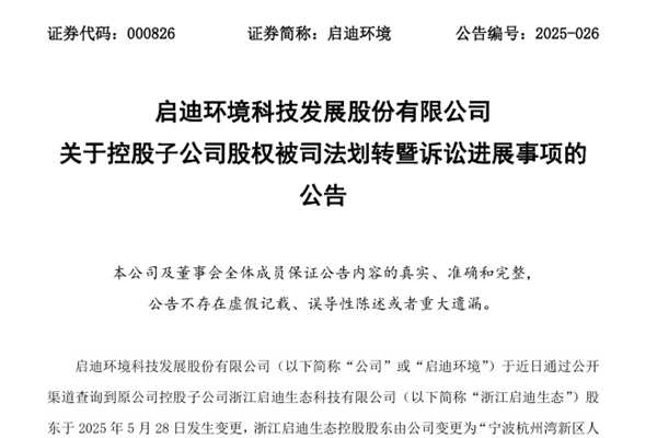 启迪环境科技发展股份有限公司(简称:启迪环境)6月3日公告称,原公司控股子公司浙江启迪生态科技有限公司(下称“浙江启迪生态”)股东已变更为“宁波杭州湾新区人保远望启迪科服股权投资中心(有限合伙)”(下称“人保基金”)。经向人保基金询问,启迪环境确认原由公司持有的浙...