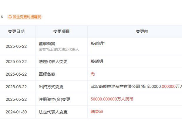 2025年5月22日,蔚能(上海)电池科技有限公司状态显示,注册资本(金)变更,从50000万提高至150000万,增幅达到200%。图源:爱企查 上海蔚能,成立于2023年12月,由武汉蔚能电池资产有限公司100%持股。 经营范围—— 一般项目:技术服务、技术开发、技术咨询、技术交流、技术转让、技术推广...