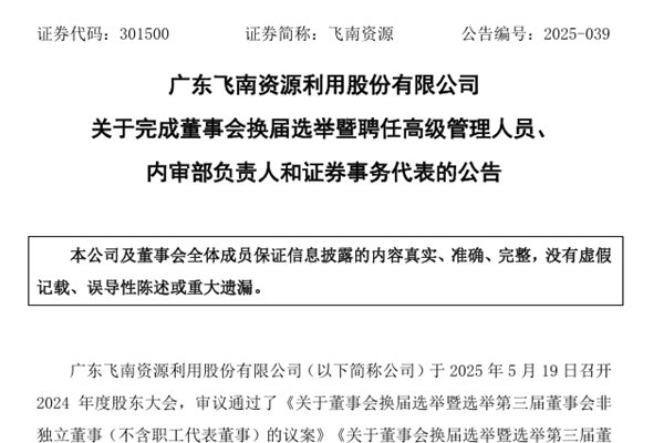 近日,广东飞南资源利用股份有限公司(简称:飞南资源)发布公告称,飞南资源已完成董事会换届选举工作,公司选举孙雁军为董事长,聘任孙启蒙女士、俞挺先生、熊小军先生为副总经理。 此外,公司还选举孙雁军先生、雪娟女士、孙启蒙女士、何金堂先生、李晓娟女士为非独立董事,陈正旭先生、钟敏先生(会计专业人士)、章小炎先生为独立董事。 孙雁军先生,...