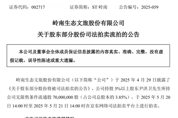 岭南生态文旅股份有限公司(简称:ST岭南)近日公告称,根据京东网络司法拍卖平台显示的拍卖结果,2025年5月20日14:00时至2025年5月21日14:00时止所进行司法拍卖的尹洪卫先生持有的70,000,000股公司股份因无人出价已流拍。据悉,ST岭南持股5%以上股东尹洪卫先生所持公司无限售条件流通股70,000,000股(占公司...