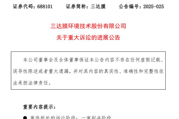 三达膜环境技术股份有限公司(简称:三达膜)近日公告称,公司已收到陕西省西安市雁塔区人民法院电子送达的《民事判决书》。法院一审判决三达膜向蓝晓科技支付合同价款4744万元以及逾期付款违约金、律师费80万元、保全担保费4.69万元。图源:三达膜公告 申明:本站发布此信息的目的在于传播更多信息,与本站立场无关。并且郑重提示所有阅读者,股市...