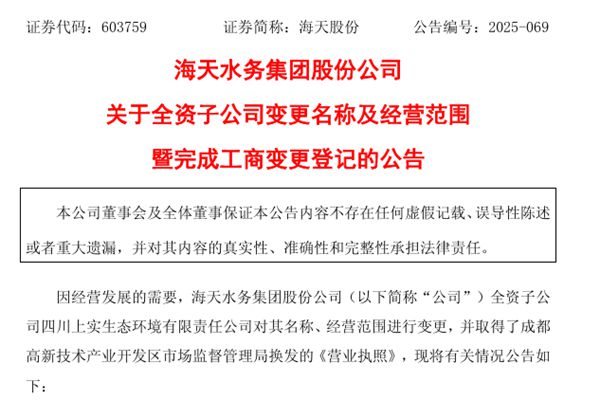 海天水务集团股份公司(简称:海天股份)公告称,因经营发展的需要,公司全资子公司四川上实生态环境有限责任公司名称、经营范围发生了变更,并取得了成都高新技术产业开发区市场监督管理局换发的《营业执照》,详情如下: 一、名称变更情况 变更前:四川上实生态环境有限责任公司 变更后:四川海天绿能生态环境有限公司 二、经营范围变更情况 变...