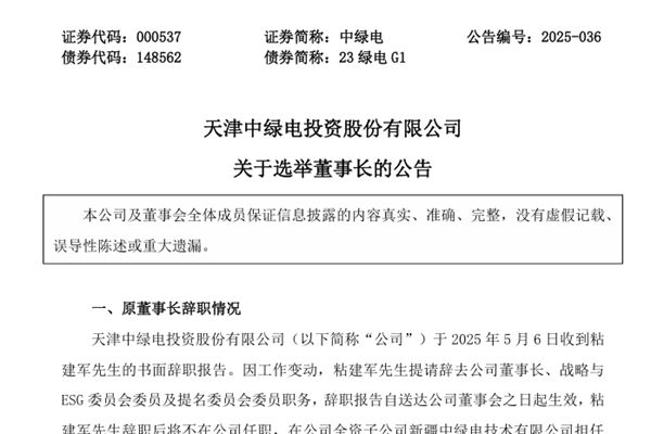 天津中绿电投资股份有限公司(简称:中绿电)近日公告称,公司于2025年5月7日召开第十一届董事会第十七次会议,以9票赞成、0票反对、0票弃权,审议通过了《关于选举周现坤先生为公司董事长的议案》,同意选举周现坤先生为公司董事长,任期与第十一届董事会任期一致。 周现坤先生简历 周现坤,男,56岁,中共党员,大学学历,正高级会计师。现任...