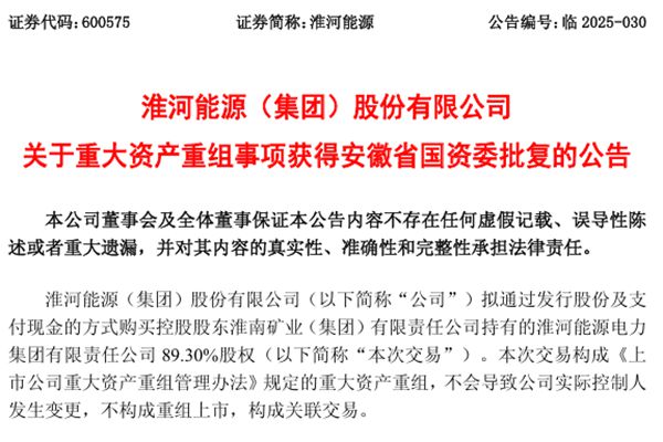 淮河能源(集团)股份有限公司(简称:淮河能源)近日公告称,公司已经收到控股股东转发的安徽省人民政府国有资产监督管理委员会做出的《省国资委关于淮南矿业(集团)有限责任公司与淮河能源(集团)股份有限公司重大资产重组有关事项的批复》(皖国资产权函〔2025〕158号),原则同意公司重大资产重组方案。 据悉,淮河能源拟通过发行股份及支付现金...