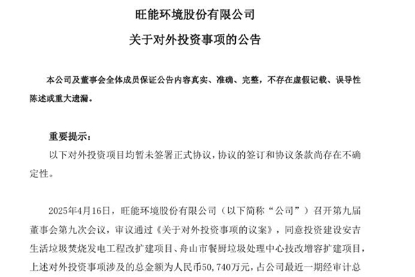 2025年04月18日, 旺能环境股份有限公司发布《关于对外投资事项的公告》。图源:旺能环境公告 第九届董事会第九次会议,同意投资建设安吉生活垃圾焚烧发电工程改扩建项目、舟山市餐厨垃圾处理中心技改增容扩建项目,上述对外投资事项涉及的总金额为人民币50,740万元,占公司最近一期经审计总资产(144.80亿元)的3.50%,占公司最近...