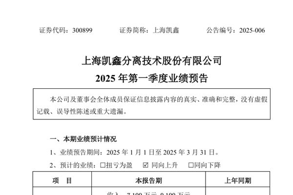 上海凯鑫分离技术股份有限公司 (简称:上海凯鑫)近日印发《2025 年第一季度业绩预告》。报告期内,上海凯鑫预计营业收入7,100万元–9,100万元,比上年同期增长127.13% - 191.11%;归属于上市公司股东的净利润盈利1,700万元–2,150万元,比上年同期增长247.81% - 339.88%...
