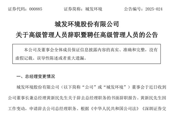城发环境股份有限公司(简称:城发环境)公告称,公司董事会于近日收到董事长兼总经理黄新民先生关于辞去总经理职务的书面辞职报告。黄新民先生因工作变动,申请辞去公司总经理职务。黄新民先生辞去总经理职务后,仍继续担任公司第七届董事会董事、董事长及董事会战略委员会主任委员职务。 经董事长提名,董事会提名委员会审核同意,公司董事会同意聘任李戈先...