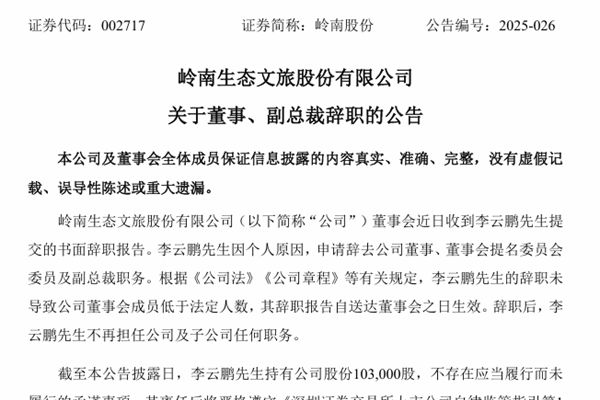 岭南生态文旅股份有限公司(简称:岭南股份)4月12日公告称,李云鹏先生因个人原因,申请辞去公司董事、董事会提名委员会委员及副总裁职务。 截至本公告披露日,李云鹏先生持有岭南股份股份103,000股,不存在应当履行而未履行的承诺事项,其离任后将严格遵守《深圳证券交易所上市公司自律监管指引第1号——主板上市公司规...
