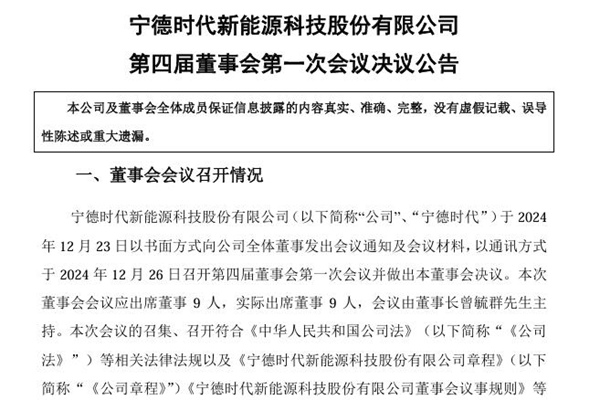 2024年12月27日,宁德时代新能源科技股份有限公司发布《2024 年第一次临时股东大会决议公告》。图源:宁德时代公告 公告称,本次股东大会会以现场投票与网络投票相结合的表决方式审议通过了《关于董事会换届选举暨提名第四届董事会非独立董事候选人的议案》。 本议案采取累积投票制的方式选举曾毓群先生、李平先生、周佳先生、潘健先生、欧阳...