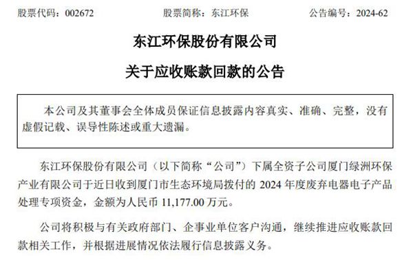 1 东江环保下属子公司,收到应收账款回款1.12亿元 解决拖欠账款问题,中央政策的效果正在逐步显现。 12月17日,东江环保发布《关于应收账款回款的公告》。公告显示,东江环保下属全资子公司厦门绿洲环保产业有限公司(下称“厦门绿洲”),近日收到了厦门市生态环境局拨付的2024年度废弃电器电子产品处理专项资金,...