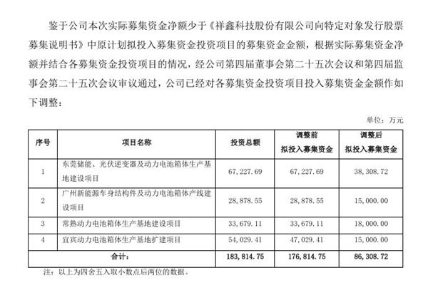 2024年11月28日,祥鑫科技股份有限公司发布《关于使用募集资金向全资子公司增资以实施募集资金投资项目的公告》。图源:祥鑫科技公告 公告显示,祥鑫科技将使用募集资金向全资子公司祥鑫(东莞)新能源科技有限公司增资以实施募集资金投资项目。 本次募集资金投资项目“东莞储能、光伏逆变器及动力电池箱体生产基地建设项目&rdqu...
