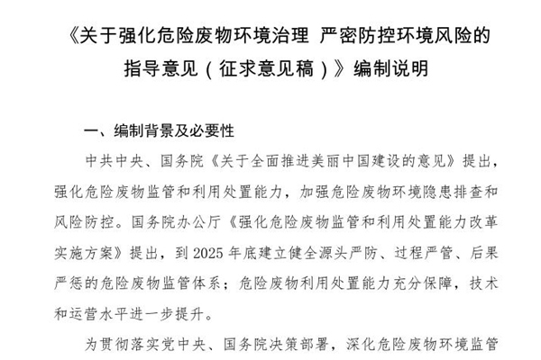 关于公开征求《关于强化危险废物环境治理 严密防控环境风险的指导意见(征求意见稿)》意见的函 为贯彻落实《中华人民共和国固体废物污染环境防治法》,深化危险废物环境监管方式改革,优化利用处置方式,严密防控危险废物环境风险,我部组织编制了《关于强化危险废物环境治理 严密防控环境风险的指导意见(征求意见稿)》,现公开征求意见(征求意见稿及编制说...