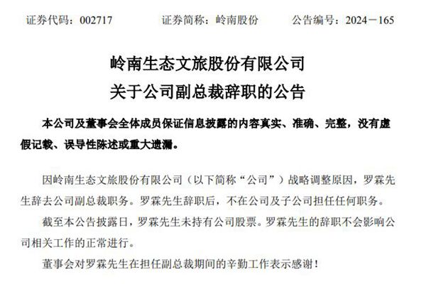 岭南生态文旅股份有限公司(简称:岭南股份)近日公告称,因公司战略调整原因,罗霖先生辞去公司副总裁职务。罗霖先生辞职后,不在公司及子公司担任任何职务。 岭南股份创立于1998年,围绕“生态+文旅”的战略发展方向,业务聚焦规划设计、市政与园林、水利水务水环境、文化科技与旅游、光伏投资建设、林业碳汇、土地整治等,通...