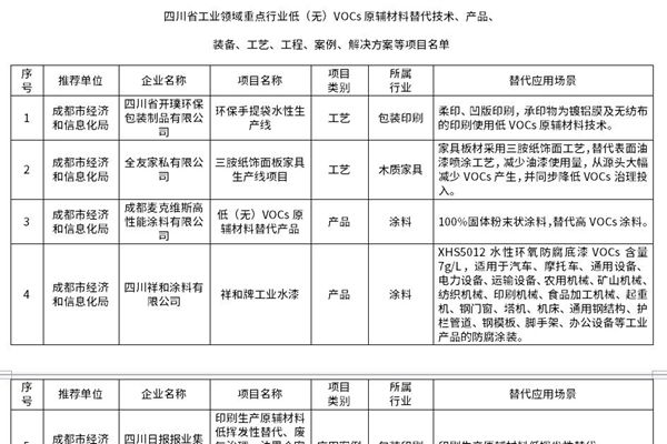 关于发布四川省工业领域重点行业低(无)VOCs原辅材料替代技术、产品、装备、工艺、工程、案例、解决方案等项目名单的通知 川经信环资〔2024〕212号 各市(州)经济和信息化局、生态环境局、市场监管局、新闻出版局: 根据四川省经济和信息化厅等4部门《关于开展工业领域重点行业低(无)VOCs原辅材料替代技术、产品、工艺、装备、工程...