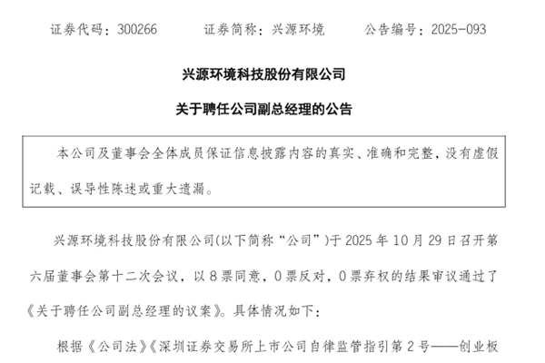 兴源环境科技股份有限公司(简称:兴源环境)近日公告称,经公司总经理提名,董事会提名委员会审查,董事会同意聘任吴文华先生为公司副总经理,任期自本次董事会审议通过之日起至公司第六届董事会届满之日止。 吴文华先生,1978年生,中国国籍,无境外永久居留权,华中科技大学法学硕士。曾任亿利生态修复股份有限公司华中事业部总经理助理,兴源环境科技...