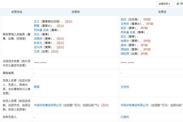 据天眼查,华电新疆发电有限公司(下称“华电新疆公司”)11月1日发生了工商变更,原董事兼总经理王义、董事长韩嵩、董事梁璟洲、董事彭桂云、董事应光伟、监事王涛退出,新增总经理田亚、董事长王秀林、董事田亚、董事余建华、董事居斌、董事蒋晓明、监事胡佐君。图源:天眼查 据悉,华电新疆公司成立于2006年,位于新疆维吾...