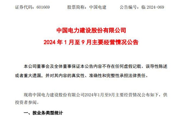 中国电力建设股份有限公司(简称:中国电建)近日发布《2024 年 1 月至 9 月主要经营情况公告》。 公告显示,2024年1月至9月,中国电建新签合同金额8611.23亿元,同比增长5.42%。按业务类型,能源电力业务新签合同金额5183.9亿元,同比增19.68%;水资源与环境业务1119.74亿元,同比降10.07%;城市建设...