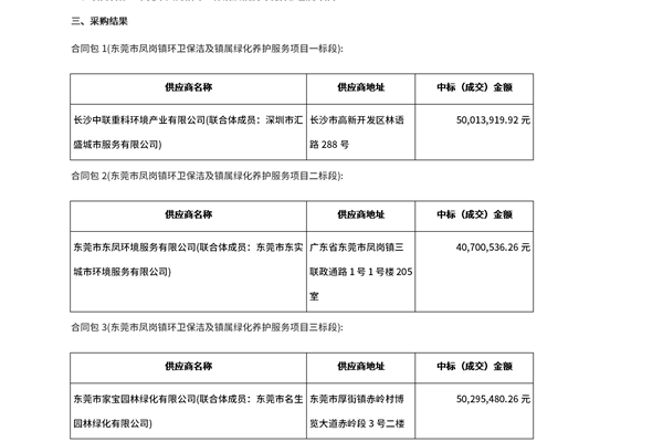 东莞市凤岗镇环卫保洁及镇属绿化养护服务项目结果公告,合同包1由长沙中联重科环境产业有限公司(联合体成员:深圳市汇盛城市服务有限公司)获得,合同包2定了东莞市东凤环境服务有限公司(联合体成员:东莞市东实城市环境服务有限公司),合同包3被东莞市家宝园林绿化有限公司(联合体成员:东莞市名生园林绿化有限公司)拿下。...