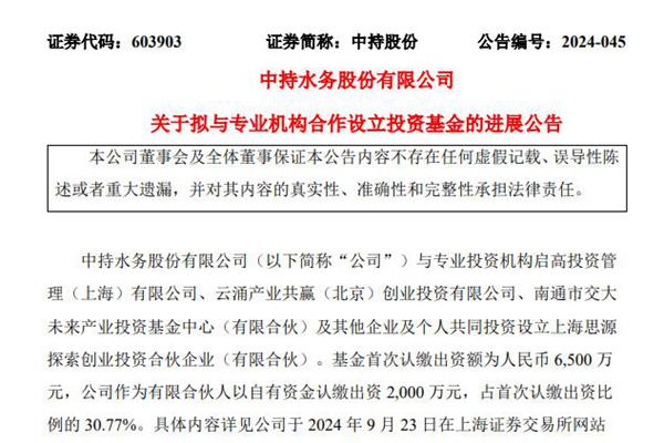 中持水务股份有限公司(简称:中持股份,下称“中持水务”)10月8日公告称,公司与专业投资机构及其他企业及个人共同投资设立的上海思源探索创业投资合伙企业(有限合伙),已按照法律法规的要求完成了企业登记手续。 该基金首次认缴出资额为人民币 6,500 万元,中持水务作为有限合伙人以自有资金认缴出资 2,000 万...
