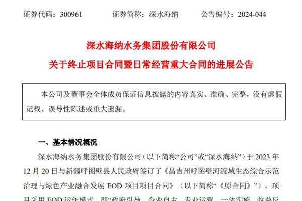 深水海纳水务集团股份有限公司(简称:深水海纳)9月13日发布《关于终止项目合同暨日常经营重大合同的进展公告》,表示公司已经与新疆呼图壁县人民政府签署了《昌吉州呼图壁河流域生态综合示范治理与绿色产业融合发展 EOD 项目(下称“项目”)终止协议》,原定合作期限30年、近期计划估算总投资26,441.30 万元的项...