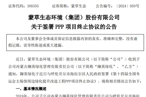 2024年9月,蒙草生态环境(集团)股份有限公司(下称“蒙草生态”)发布《关于签署 PPP 项目终止协议的公告》。 公告明确,蒙草生态收到子公司内蒙古撷英绿化管理有限责任公司通知,撷英绿化于近日与呼伦贝尔市海拉尔区人民政府签署《第十四届全国冬运会主场馆周边绿化提升改造工程PPP项目终止协议》。 公告提示,双...