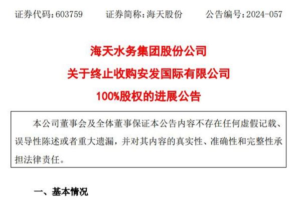 海天水务集团股份公司(简称:海天股份)近日公告了“终止收购安发国际有限公司100%股权”事项的进展情况。据悉,经中国水业敦促,深圳市海晟环保科技有限公司已经全额返还海天股份之前支付的5,400万元。 这笔交易开始于今年3月,海天股份原计划以自有资金2.7亿元收购安发国际有限公司100%股权,借此间接持有宜春水...