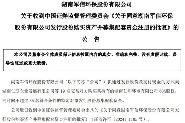 2024年8月5日,湖南军信环保股份有限公司发布关于收到中国证券监督管理委员会《关于同意湖南军信环保股份有限公司发行股份购买资产并募集配套资金注册的批复》的公告——(证监许可〔2024〕1105 号),主要内容如下: “一、同意你公司向湖南仁联企业发展有限公司发行 29,664,490 股股份、向...