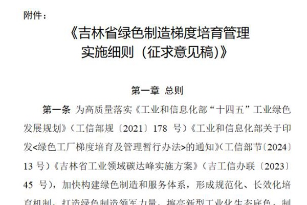 《吉林省绿色制造梯度培育管理实施细则(征求意见稿)》向社会公开征求意见 为贯彻落实《工业和信息化部关于印发的通知》(工信部节〔2024〕13号)《吉林省工业领域碳达峰实施方案》(吉工信办联〔2023〕45号),加快构建我省绿色制造和服务体系,形成规范化、长效化培育机制,打造绿色制造领军力量,擦亮新型工业化生态底色。我厅起草了《吉林省绿色...