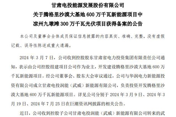 甘肃电投能源发展股份有限公司发布《关于腾格里沙漠大基地 600 万千瓦新能源项目中凉州九墩滩 300 万千瓦光伏项目获得备案的公告》。 公告称,近日,公司收到控股子公司甘肃电投润能(武威)新能源有限公司转来的武威市发改委《甘肃省投资项目信用备案证》(备案号:武威市发改委能源与环资科备[2024]2438 号),同意腾格里沙漠大基地 ...
