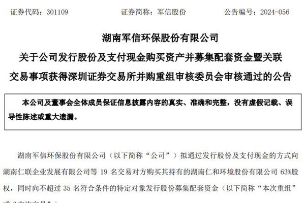 湖南军信环保股份有限公司(简称:军信股份)6月7日晚公告宣布,拟通过发行股份及支付现金的方式收购湖南仁和环境股份有限公司(下称“仁和环境”)63%股权的事项已获深交所审核通过。 据悉,此次收购将耗资21.97亿元人民币,收购完成后,仁和环境将成为军信股份控股子公司。收购完成后后,军信股份业务纵向将向固废处理产...