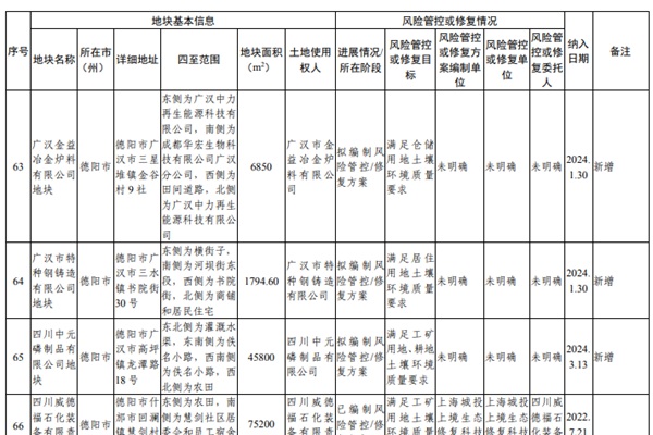 依据《中华人民共和国土壤污染防治法》《四川省建设用地土壤环境管理办法》,结合近期建设用地土壤污染状况调查评估、风险管控和治理修复等情况,四川省生态环境厅会同自然资源厅第十四次对《四川省建设用地土壤污染风险管控和修复名录》进行动态更新并予以公告。 根据公告,目前《四川省建设用地土壤污染风险管控和修复名录》包括140个地块,总共移出52...