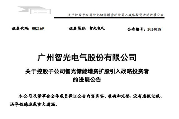 3月16日,广州智光电气股份有限公司发布进展公告,涉其控股子公司广州智光储能科技有限公司引入战略投资者对其增资。公告表示,智光储能拟增资不超过7亿元,本轮投资前,公司估值为18亿元。 公告表示,已经与广东粤财产业投资基金合伙企业(有限合伙)、国开制造业转型升级基金(有限合伙)签署了《广州智光储能科技有限公司之增资协议》及《广州智光储...